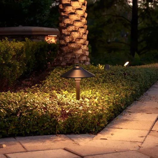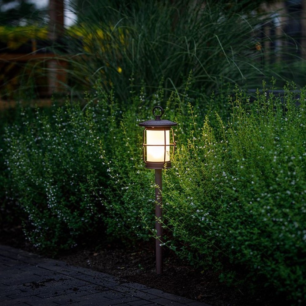 This durable brass fixture spreads warm light evenly over walkways, gardens, and driveways. It’s a favorite among residential contractors.
